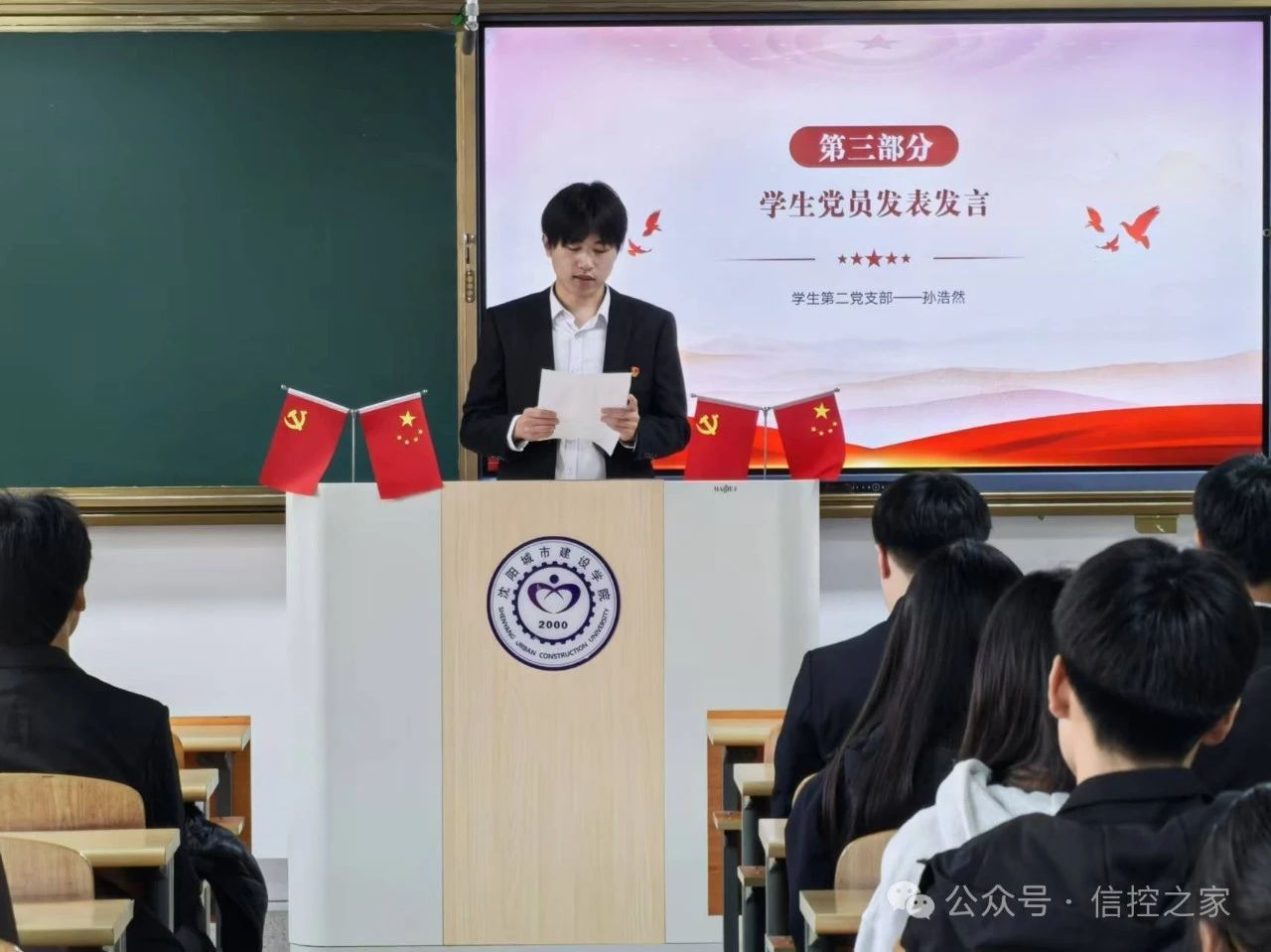 随后,学生党员代表孙浩然发言。他表示入党积极分子要始终保持蓬勃向上、意气风发的精神,积极向党组织靠拢,要以先进模范为榜样,珍惜学习机会,加强思想淬炼,不断强化责任担当,争做一名合格的学生党员。