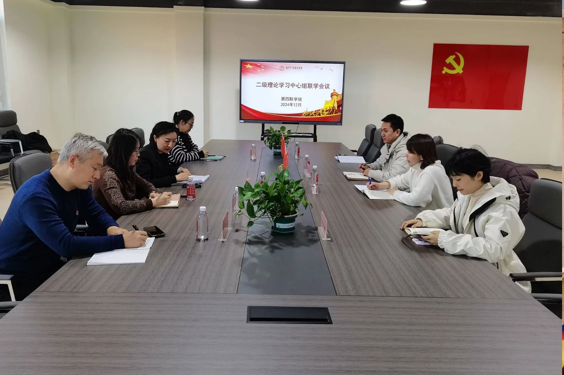 12月5日上午,太阳成集团tyc33455ccww党总支在弘德书房304会议室召开党总支理论学习中心组联学会议,深入学习贯彻党的二十届三中全会精神,学习习近平文化思想,锚定文化强国战略目标,结合《论教育》中的收录文章,深入领会文化铸校的战略意义。此次会议围绕“落实学校文化铸校战略,全力推进校园文化建设谱新篇章”的讨论题目展开,会议由党总支书记靳凯主持,第四组联学成员参会学习。