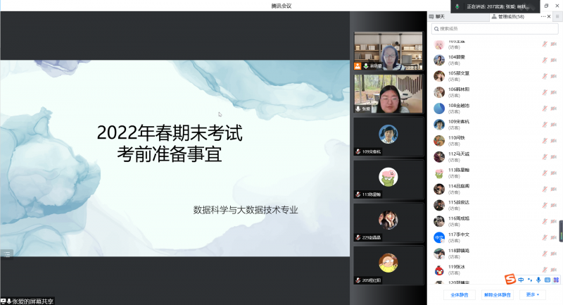 2022年春季学期期末考试临近,为学生能顺利进行“云考试”、营造良好的网络考试氛围、严肃考风考纪、杜绝各类形式的舞弊行为发生,进一步加强学生诚信教育,6月2日数据科学与大数据技术专业开展“云考试”考前教育活动。参会的有大数据专业全体师生,会议由大数据教研室主任林轶翚主持。