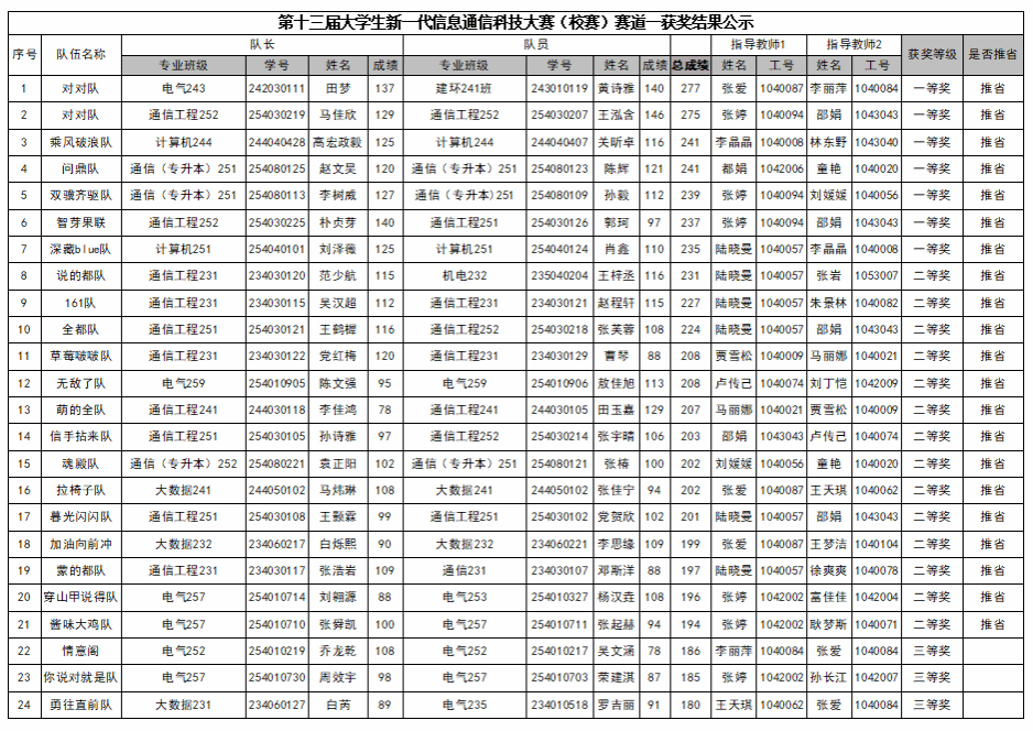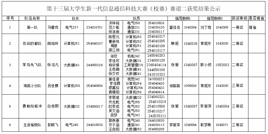 第十三届大学生新一代信息通信科技大赛(校赛)赛道一经过个人组队报名、上机考试、评审组综合评定等环节。根据最终成绩,评选出“工程实践赛(赛道1)”获奖队伍43个,其中一等奖7个、二等奖14个、三等奖22个;“产教融合5G+创新应用赛(赛道2)”获奖队伍6个,其中一等奖1个、二等奖2个、三等奖3个